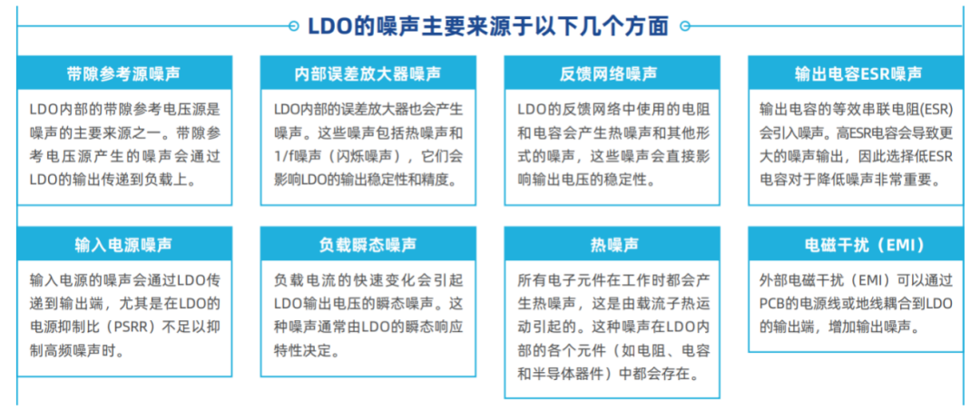 LDO为电子器件,所以一定会产生噪声。可以使用两个方法查看这些噪声:跨频率查看噪声和查看积分值形式的噪声。要生成不会影响系统性能的干净电源轨,选择低噪声LDO并采取降噪措施非常重要。由于闭环传递函数对抑制参考电压噪声效果有限,多数低噪声LDO需要额外的滤波器来阻挡噪声进入闭环。