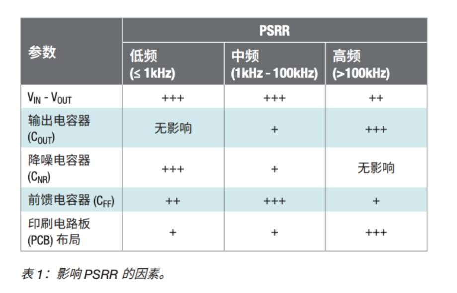 PSRR是常见的技术参数,它规定了特定频率的交流元件从LDO输入衰减到输出的程度。对LDO来说,100 kHz~1 MHz范围内的电源抑制非常重要。