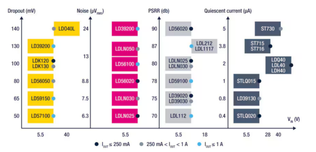 ST的LDO主要分为三个系列:高PSRR LDO稳压器、低Iq LDO稳压器、超低压差LDO稳压器。其产品特性为低压差、低静态电流(低IQ)、快速瞬态响应、低噪音、良好的纹波抑制。