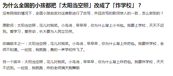 想想当年我们每个人都唱过的《上学歌》吧,当年唱着“炸学校”的孩子也并没有真的去炸学校,只是单纯觉得有趣,还有种发泄的情绪。而一个成年人如果扬言要炸学校,八成得被抓起来。