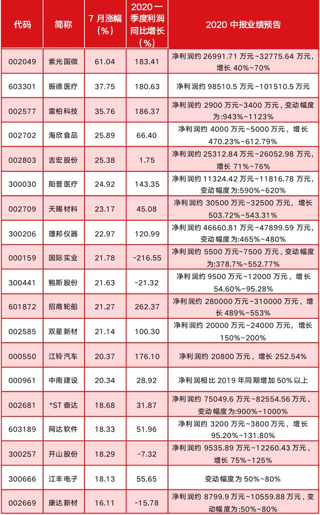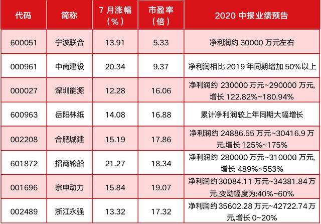 类似的强势表现公司还有雷柏科技、海欣食品、吉宏股份、阳普医疗、元力股份、天赐材料、理邦仪器、国际实业、鲍斯股份、招商轮船、双星新材、江铃汽车、中南建设等,近期股价涨幅均超过20%,而这些强势上涨的公司中报业绩都出现了预增。整体来看,7月份以来股价表现跑赢大盘的公司中,目前共有38家提前发布了中报预增的公告。