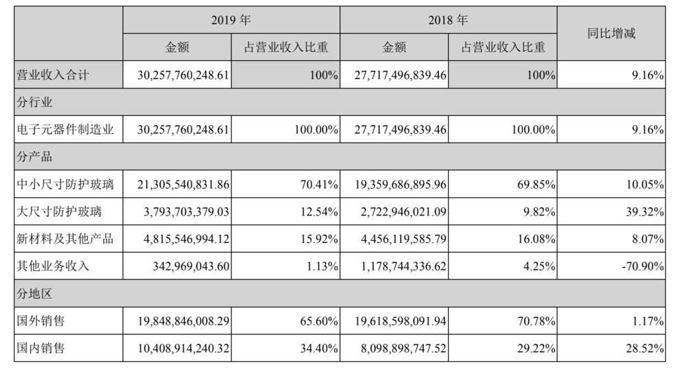 蓝思最主要的收入来自防护玻璃,也就是智能手机等设备的玻璃前盖、后盖等,新材料为第二大业务,比如金属、陶瓷、蓝宝石等等。蓝思科技在整个玻璃盖板行业的份额约为 30%,早在 2003 年,蓝思就配合摩托罗拉,首次在手机上应用了玻璃保护材质的屏幕。