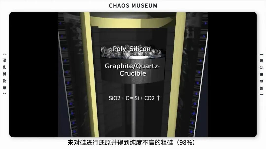 一般就是利用片头提到的结晶趋同特性。首先将石英砂——也就是低品质的二氧化硅矿石与炭在电炉中一起加热,通过还原反应(2C+SiO2=2CO+Si)来对硅进行还原并得到纯度不高的粗硅(98%)。
