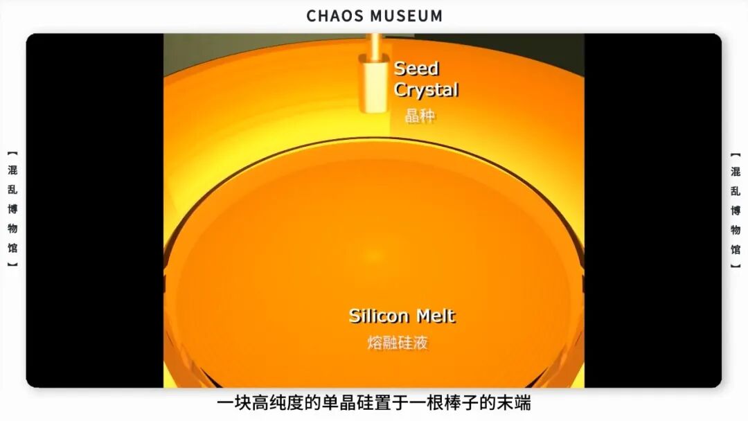 此时将晶种——一块高纯度的单晶硅置于一根棒子的末端,并与熔融状态的硅液表面接触。