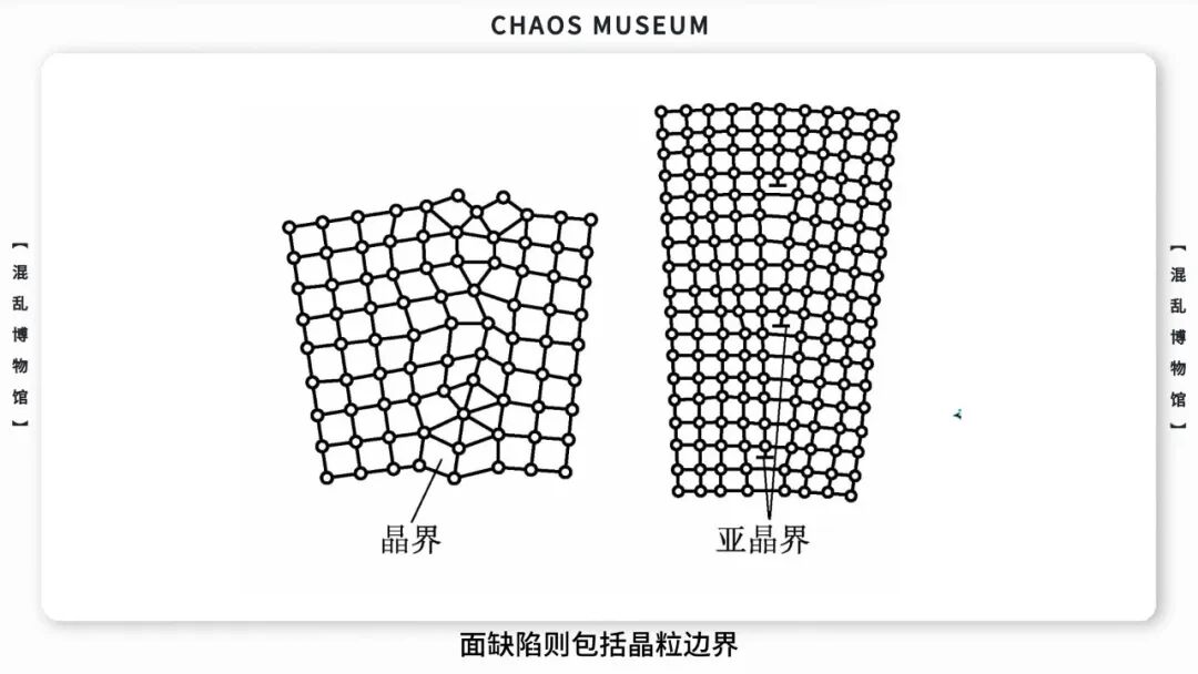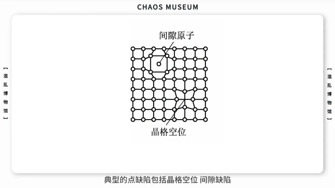 对晶体来说这些不完美表现为「晶体缺陷」。人们根据几何基础将这些晶体缺陷分为点、面、块、体。典型的点缺陷包括晶格空位、间隙缺陷,线缺陷包括刃错位、螺旋错位和向错,面缺陷则包括晶粒边界、反相畴界和孪晶界等等。