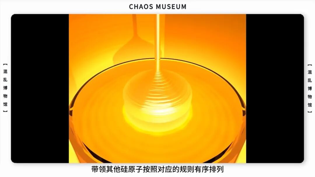 然后,将这根棒子缓慢地向上提拉,同时进行旋转。晶种会像领头羊一样带领其他硅原子按照对应的规则有序排列。这样我们就得到了一块「完美的」硅晶锭。