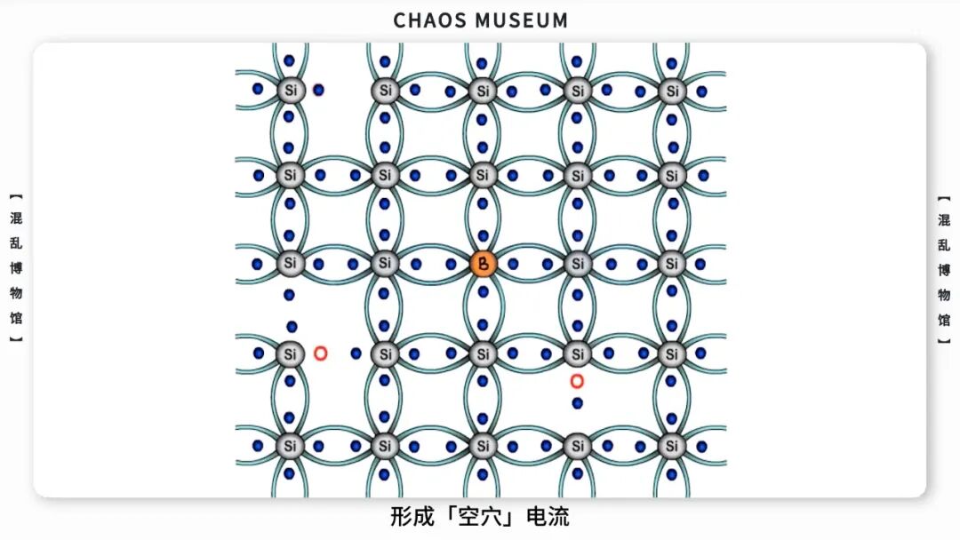 与之相对的是P型半导体(positive 为正)——即正电荷载流子或空穴型。它掺杂的元素是硼,由于硼的最外层电子只有三个,在与相邻的硅原子结合时,其中一个硼原子和硅原子形成的共价键中会有一个「空穴」。由于空穴的存在,在施加电压的情况下,相邻的电子会过来填充这个空位,因而空穴就会向着电压负极移动,形成「空穴」电流。