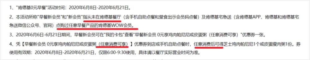 同样玩文字游戏的还有肯德基的 WOOOW 早餐季。0 元享早餐看起来很划算,但仔细看活动规则你会发现,必须是“早餐新会员”凭券任意消费之后才可以享受优惠。