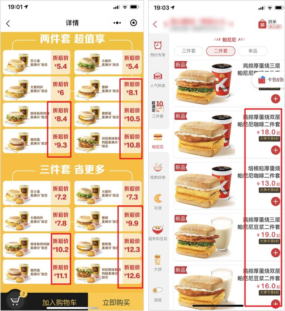 左图:麦当劳早餐卡;右图:肯德基大神卡