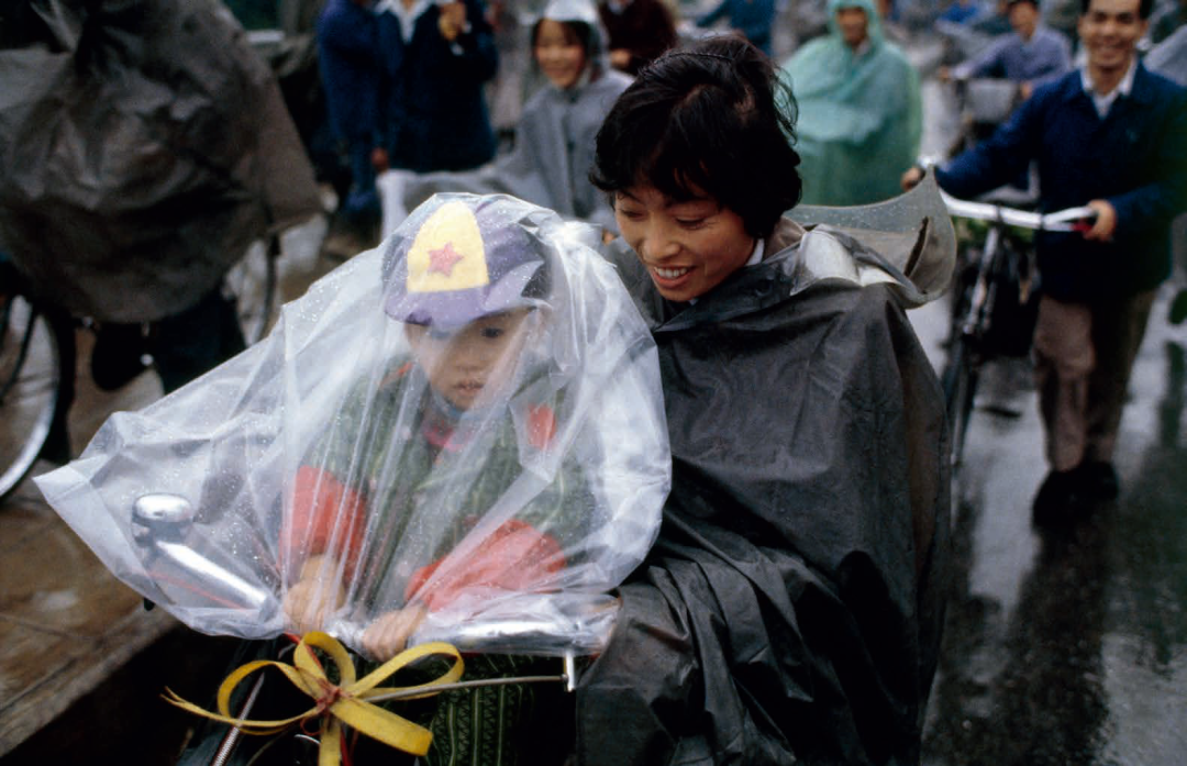 1977年12月,雨中的广州街头,一位母亲用塑料布为孩子挡雨。那个年代的中国孩子大部分都有过坐在父母自行车前杠上的经历。