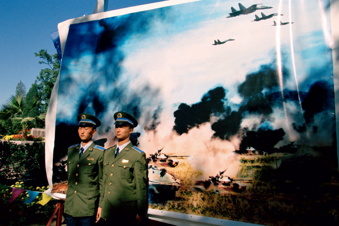 1999年10月2日,为庆祝新中国成立50周年,在北京某公园举行的军事展览上,两名军校学员在军事演习的巨幅海报前留影。