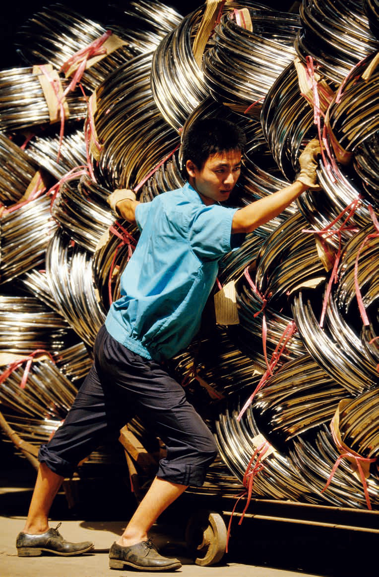 1993年6月,上海,凤凰自行车工厂的一名工人正独自推动着满满一车的轮圈。20世纪八九十年代,中国还是自行车车轮上的国度,凤凰自行车在很多人心目中有着特殊的地位。