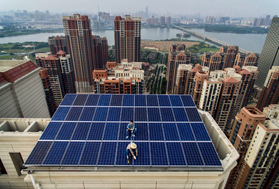 2017年5月15日,湖北武汉,工人在一座47层高的大楼顶上的太阳能电池板上作业。随着环保意识的增强和国家政策的引导,清洁能源越来越多地用在城市建设中。
