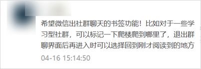 希望微信可以增设“群聊书签”的功能,对学习型社群来说会很实用。这样我就可以标记爬楼爬到哪里了,退出群聊再进入的时候可以回到刚才阅读的地方。