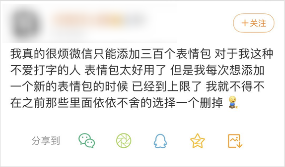 最后,微信表情包上限也一直是我很想吐槽的一个点,有这想法的还不止我一个: