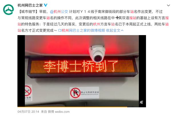 △在中英双语报站的基础上新增了杭州话 / 微博截图