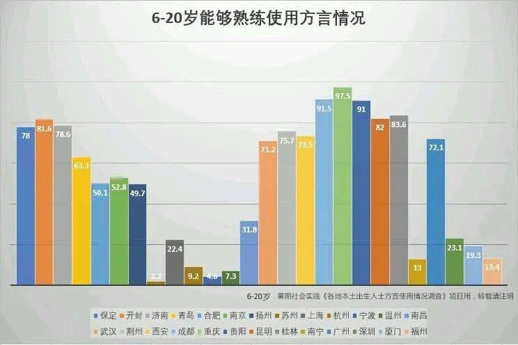 吴语爱好者“神样胡桃”曾根据各地本土出生人士方言使用情况绘制了一份“6~20岁能够熟练使用方言人群比例”的图表。