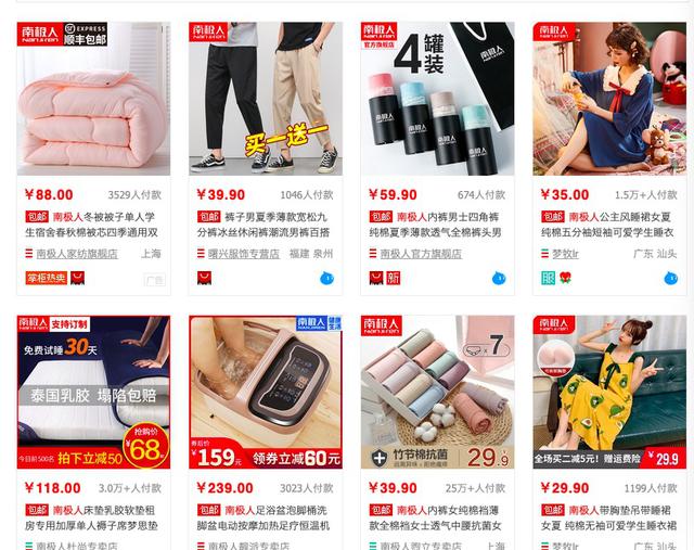 也正因此,眼下人们再在电商平台检索这些品牌,已经很难从林林总总,成千上百家相似店铺中,分辨出当年那个“恒源祥”或“南极人”。名称从官方店到企业店、专卖店、直销店、再到自营店和工厂店,主售商品则从内衣到裤袜,到家居服、日用品和按摩仪,再到食品……