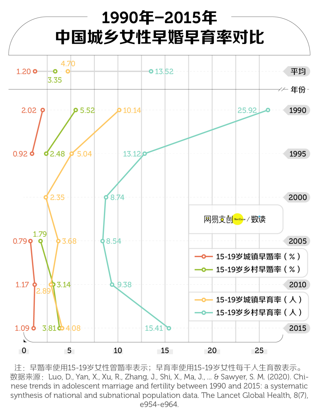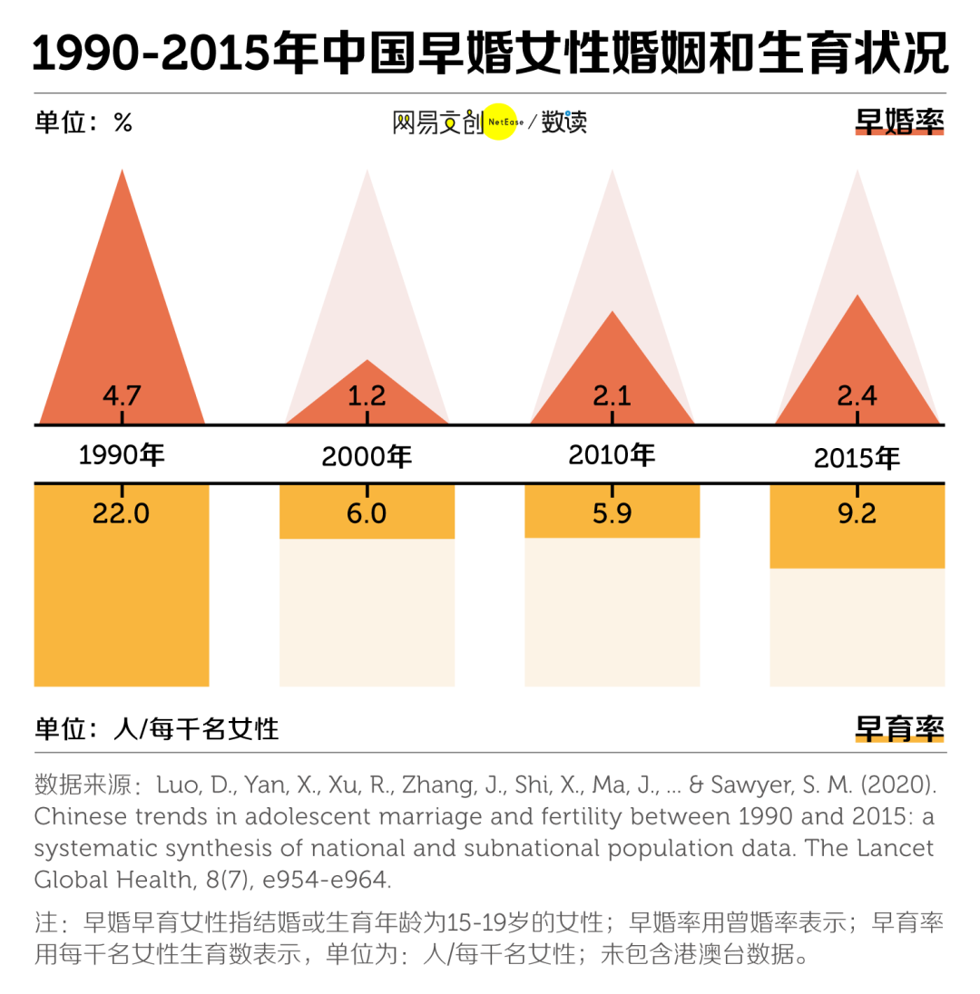 一篇发布在《柳叶刀-全球健康》(The Lancet Global Health)上的研究发现,在经历了 1990~2000 年的大幅下降之后,中国女性早婚率从 2000 年开始再次上升,从 1.2 % 上升至 2015年的 2.4 %。