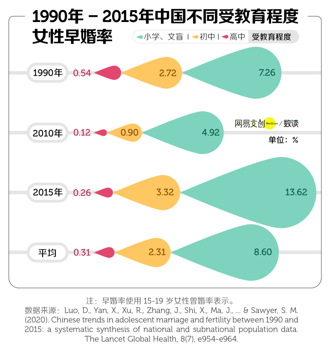 《柳叶刀-全球健康》的研究成果也显示,学历越高的女性早婚率越低,而学历越低的女性早婚率反弹幅度越大。