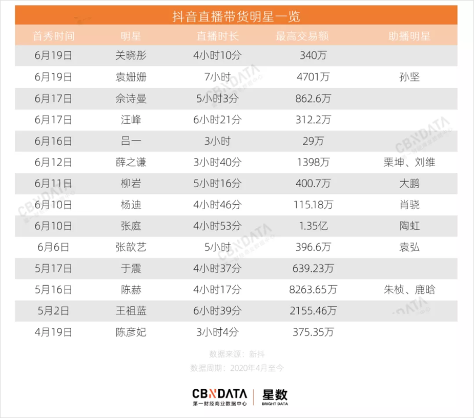 从 4 月份开始,抖音请了包括陈赫、关晓彤、王祖蓝、薛之谦、汪峰在内共计14位明星上阵带货。