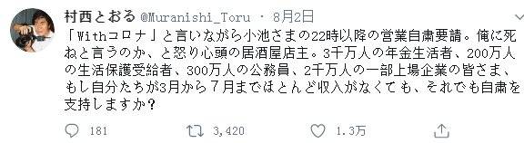 翻译:小池(东京都知事)一边说着“习惯新冠的存在”,一边要求(酒馆饭店等)22点以后停止营业。带着愤怒心情的居酒屋店主说“是想让我死吗”。对于3千万靠养老金生活的人、200万领取最低生活保障的人、300万的公务员、2千万在东证一部上市公司工作的各位(指日本一流企业),假如诸位从3月到7月几乎没有收入,也会支持政府的自肃请求吗?