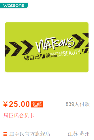 屈臣氏在淘宝官方旗舰店出售的会员卡,价格提高到25元,有800余人下单。/淘宝