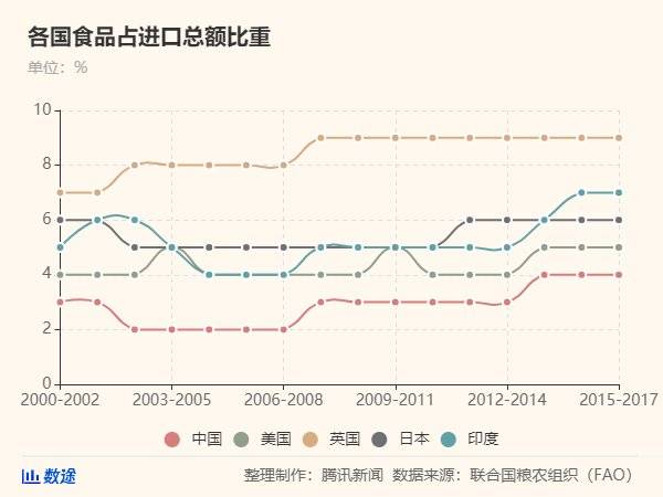 结合联合国粮农组织(FAO)数据来看,统计周期内,我国食品占进口总额的比重也一直稳定2%~4%,低于美国在内的统计国家(如下图所示)。