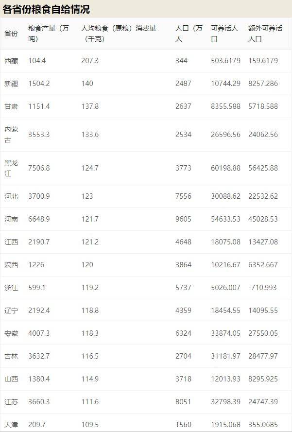 以黑龙江为例,根据统计局公布的数据,全省年粮食产量7506.8万吨、人均粮食消费量124.7千克/年、全省人口3773万,可以算出,本省粮食“可养活人口”60198万。除去本省人口,还能养活56425万人。