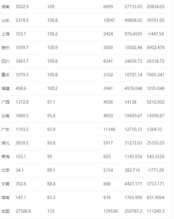 除了黑龙江,河南、山东等省份也可以供应超出自身数倍、甚至十余倍的“口粮”。从下图可以看出,除北京、上海、浙江外的29个省份都可实现“自给”。