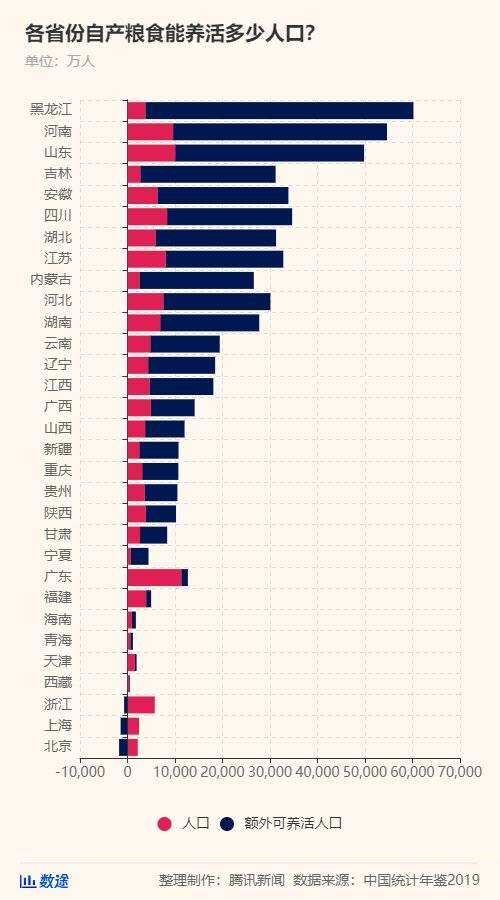其中,红色代表本省份人口数量,蓝色代表除供应本地人口外,剩余粮食产品可“养活”的人口数量。