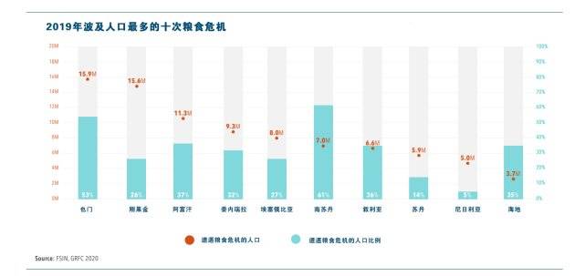 据联合国粮食及农业组织(FSIN)数据显示,2019年,处于严重粮食缺乏状态的人口波及55个国家和地区、全球1.35亿人口受到影响。