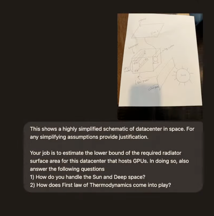 他手绘了一张包含太阳能板、GPU机架和散热系统的草图。与地球上可以用空气或水冷却不同,太空中只能通过辐射散热。Hyun Wan故意省略了散热板温度这个关键参数,以测试模型处理模糊信息的能力。