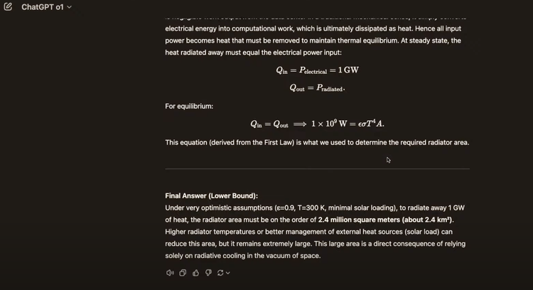 结果o1仅用10秒就完成了分析:正确识别了1千兆瓦的功率值,理解了散热限制,自主选择了合适的散热板温度,最终计算出需要242万平方米(相当于旧金山面积的2%)的散热板。
