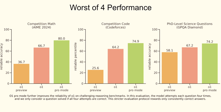 与o1和o1-preview相比,o1 pro在数据科学、编程和案例分析等领域表现更加出色。为了验证其可靠性,OpenAI采用了严格的“4/4可靠性”标准:只有模型在四次尝试中都给出正确答案,才被视为成功解决问题。
