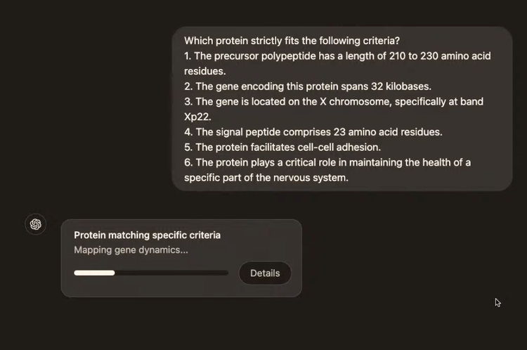在Jason的最后演示中,他让o1 pro寻找一种符合六个特定标准的蛋白质。问题的难点在于每个标准都涉及专业的化学知识,且单个标准可能对应数十种符合条件的蛋白质,模型需要筛选出同时满足所有标准的正确答案。