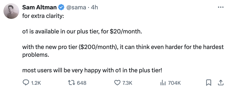 逼得奥特曼另发文解释:大多数人用每月20刀的o1就足够,o1 pro是为最棘手问题准备的,觉得贵不买就行!