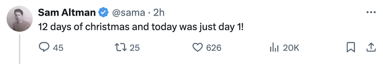 今天的直播只有15分钟。奥特曼说,“我们会尽量让这个过程有趣且快速,不会花太长时间,但可以展示我们一直在做的工作,也算是给大家的一份节日礼物。”并且预告明天会带来一些“适合开发者的好东西”。