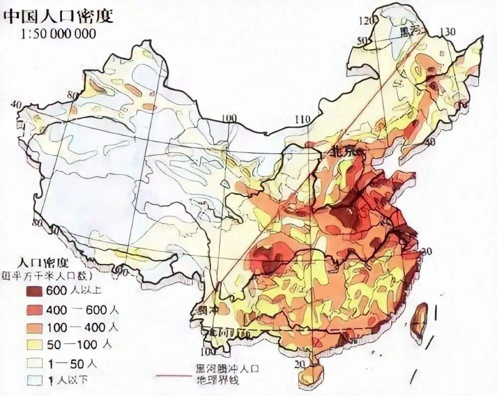 大量人口集中在胡焕庸线以东. 图片来自:百度百科
