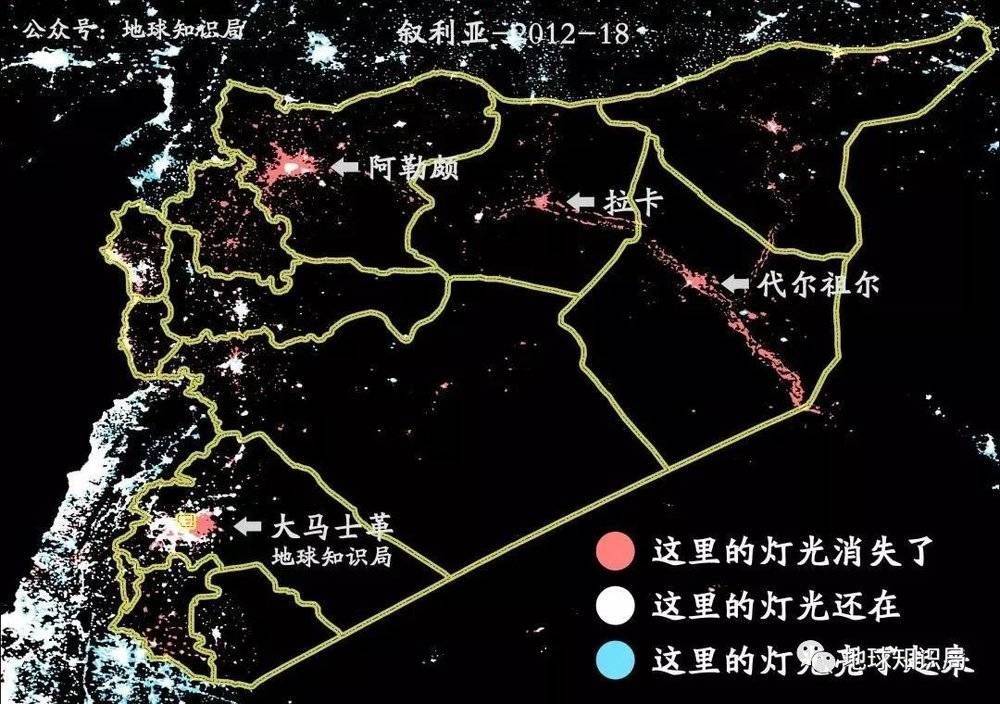 叙利亚已经很可怜了,在数年内战中,国内的“灯光”已经减少了很多,这次又遭此大难(叙利亚2012-2018年灯光变化示意)