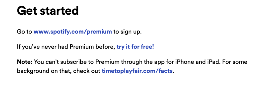 如果你访问 Spotify 官网介绍会员服务的页面,你会看到一段带有超链接的脚注,指向文章《通过 5 个事实认识到苹果有多么不公平》,说明自己为此付出的代价,例如苹果不允许 Spotify 在自己的 App 里直接告诉用户订阅方式,只能由用户自己寻找。