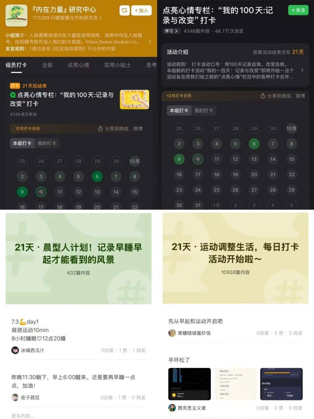 豆瓣小组“内在力量”研究中心,网友们的打卡记录
