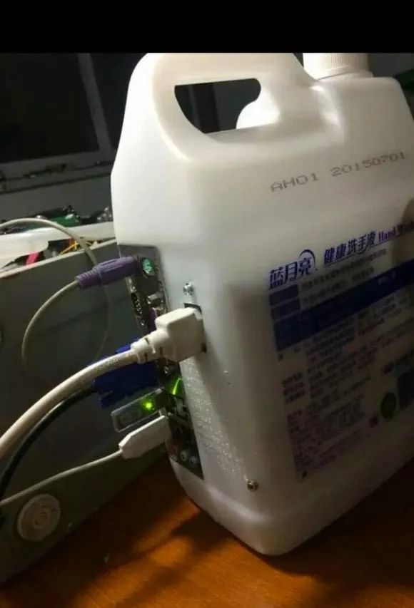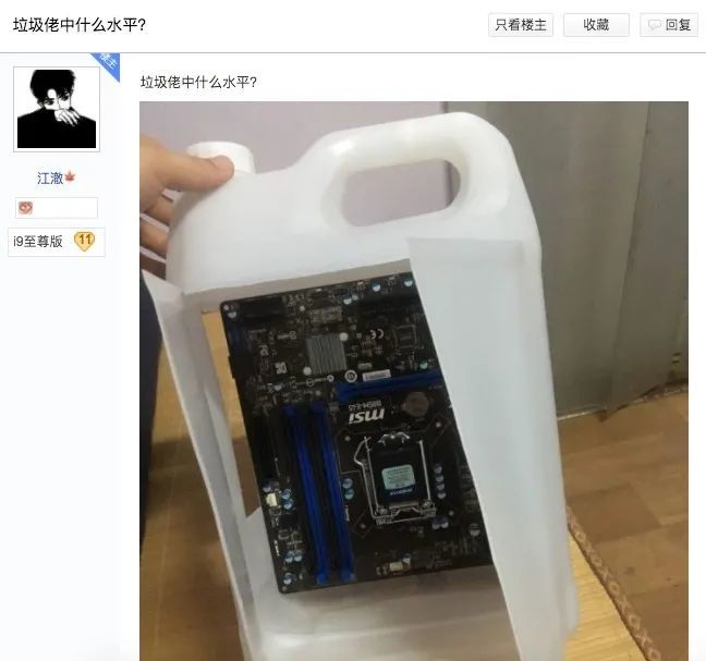 在一篇发于2017年12月7日,名字叫《垃圾佬中什么水平?》的帖子中,楼主将自己的电脑主板和硬盘塞进了塑料壶里,抛砖引玉直接炸出了潜藏在图吧深处的大师们。