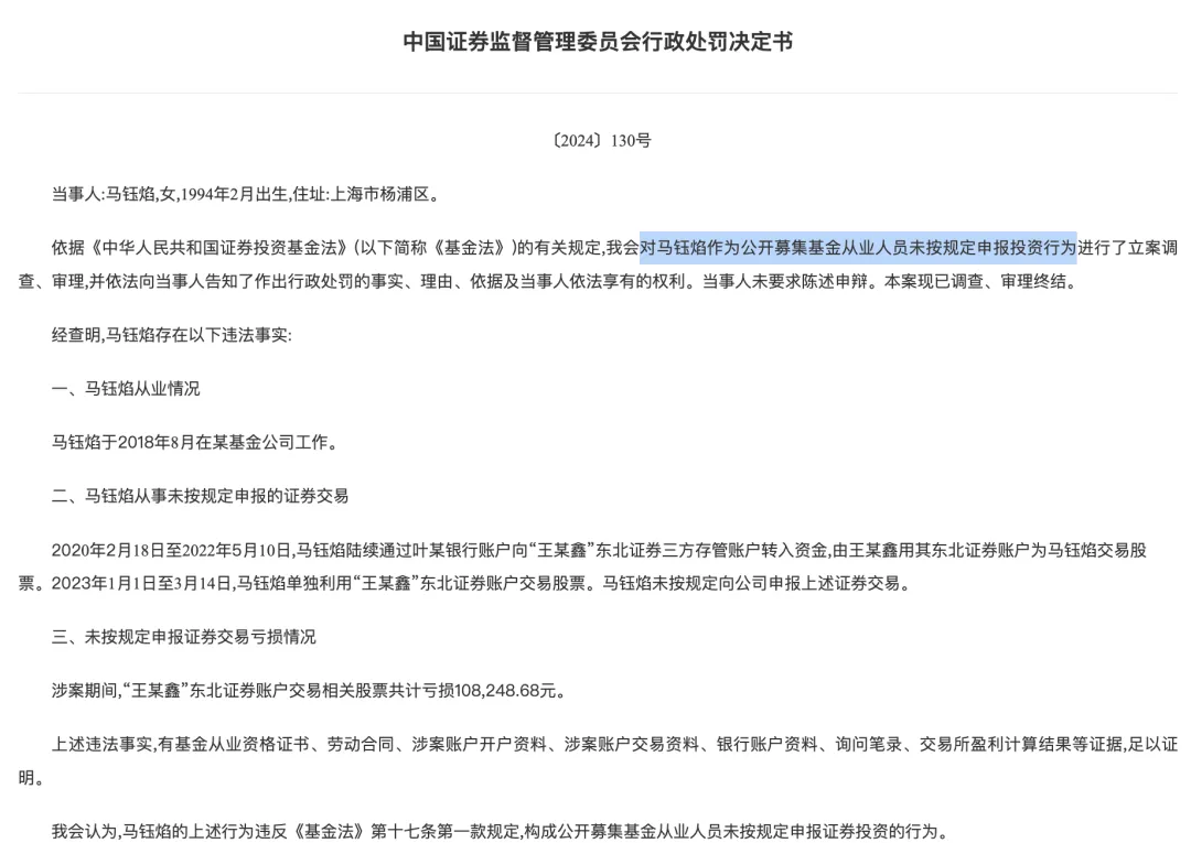 据证监会同日披露,一90后公募从业人员未按规定申报、并利用他人账户炒股亏超10万元后,被罚3万元。