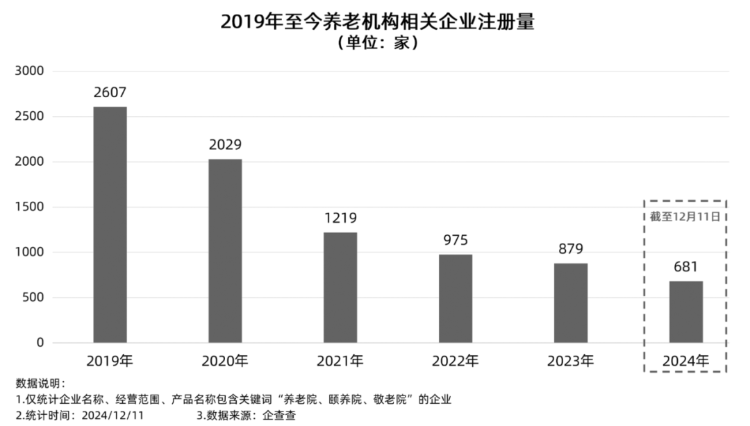 企查查提供给经济观察的数据显示,从2019年至今,养老机构相关企业(仅统计企业名称、经营范围、产品名称包含养老院、颐养院以及敬老院的企业)注册量呈快速下降的趋势。其中,截至2024年12月11日,全国养老机构相关企业注册量为681家,相比于2023年全年下降了22.5%,仅为2019年全年的26%。