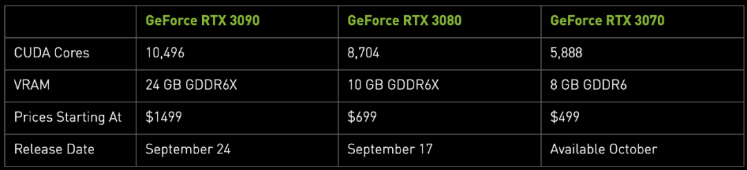 另外需要注意的是 GPU 代工厂,今天发布的 GeForce RTX 30 系列均采用了三星的 8 纳米制程“英伟达定制工艺”,选择三星而不是台积电,不知是出于什么样的考虑。