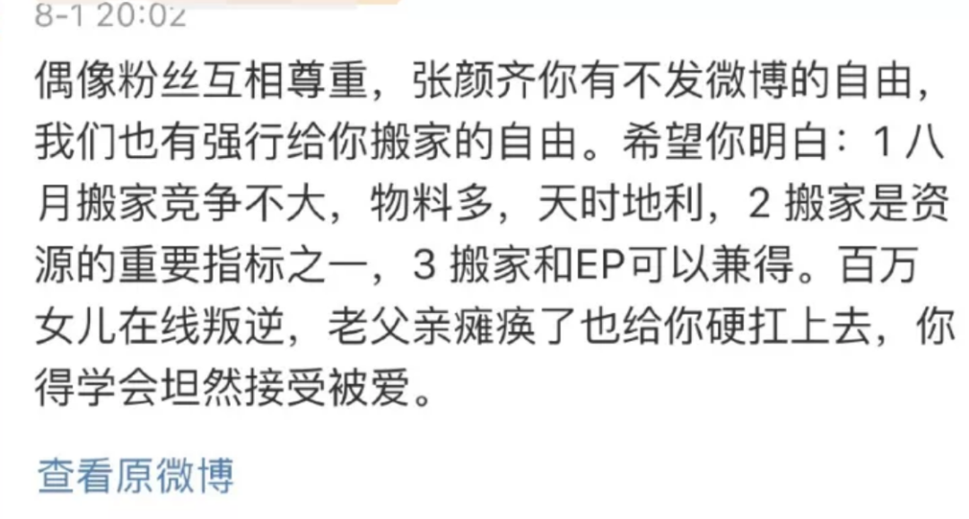 当8月的31号过去,粉丝终于可以安心睡去,被搬家动用的人力财力震惊的圈外,则开始用“胡闹”“粉丝自嗨”“大型割韭菜活动”来总结这场活动。