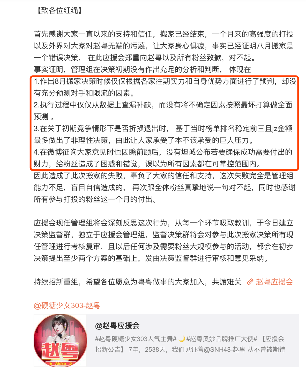 从这份道歉信可以看出,赵粤家在本次搬家中的集资金额一度是最多的,而“没有坦诚公布确保成功需要付出的财力”,似乎是认为投的钱还不够多。8月搬家是根据“各家往期实力和自身优势”决定的,但最终被证明是“错误的决策”,也让赵粤本人及其粉丝组织付出了惨痛的代价。粉丝已经开始质疑组织能力甚至集资金额去向。