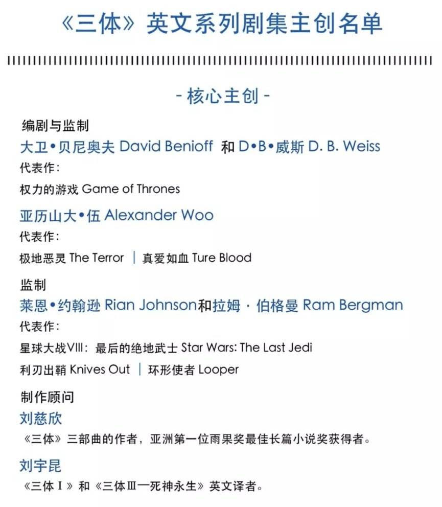 《三体》原著作者刘慈欣以及《三体》的英文译者刘宇昆将共同担任这部美剧的制作顾问,《权力的游戏》两位编剧David Benioff和D.B.Weiss携手《极地恶灵》第2季运作人Alexander Woo打造,莱恩·约翰逊、裴淳华和布拉德·皮特的Plan B任执行制作方。