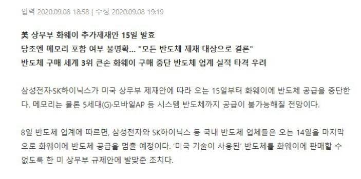 9月9日消息,据《朝鲜日报》和其他韩国媒体报道,三星和SK海力士将从9月15日起停止向华为出售零部件。